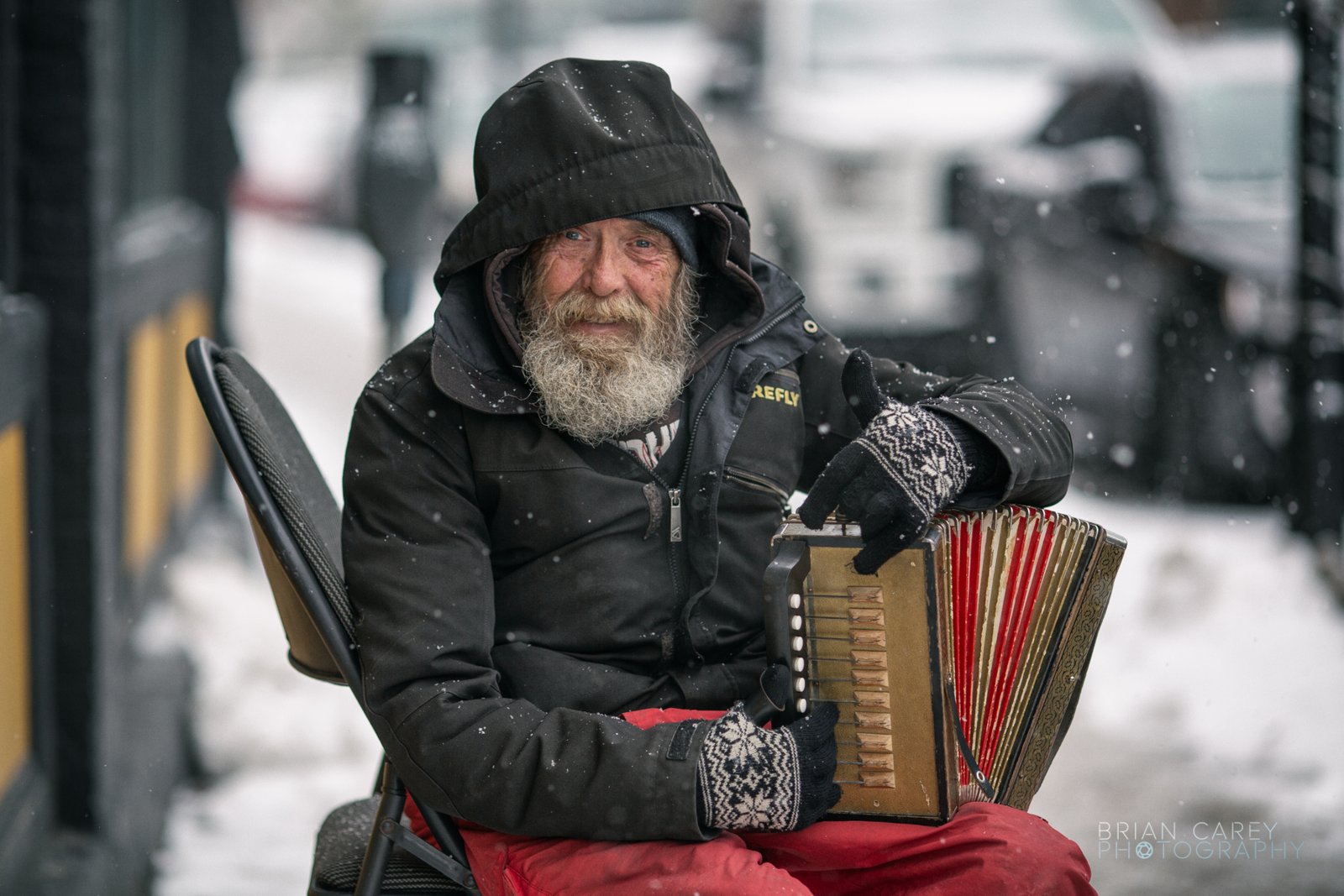 Donnie Tucker was an accordion player who busked in downtown St. John’s, Newfoundland, for almost 30 years, beginning in the mid-1990s. I photographed him dozens of times, always trying to capture his style in an interesting composition. We both had fun with it. Often, I would stop for a chat, and he would tell me about his troubles with women or his dog, Zoey. He loved dogs, and many people walking theirs downtown would stop to say hi. Some even told me their dogs looked forward to seeing him! Donnie busked year-round, even through our rough Newfoundland winters.